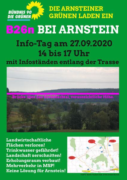 Der Ortsverband Arnstein von B90/Die Grünen lädt zu drei Infoständen an der geplanten Trasse der B26n zwischen Müdesheim und Arnstein ein.